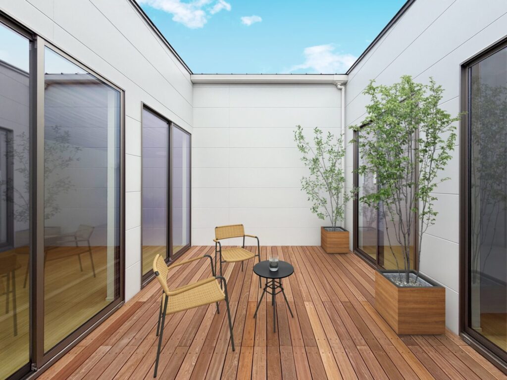 365日楽しめるウッドデッキ中庭